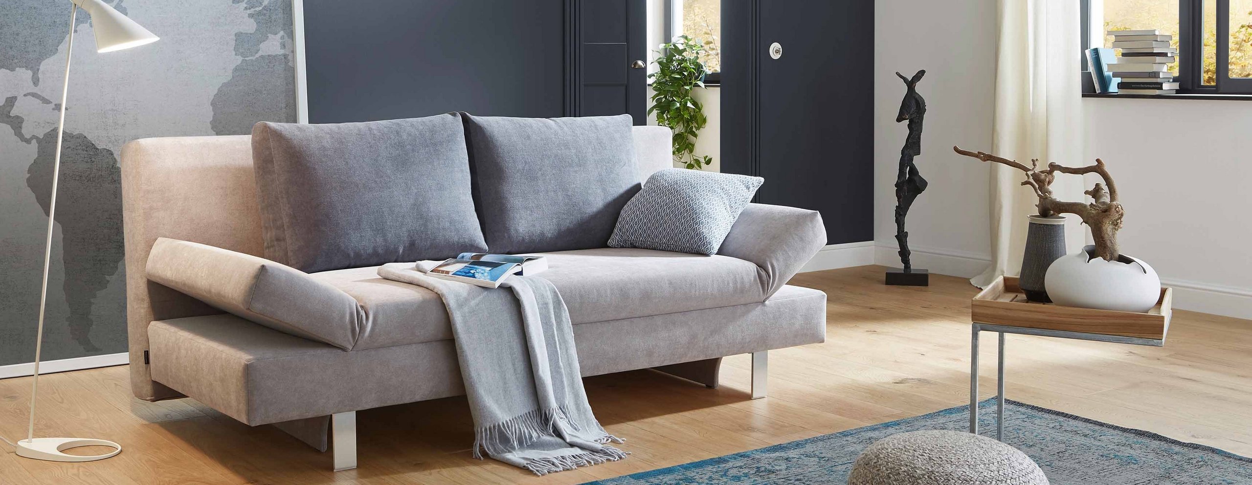 Gemütlich mit Holz-/ Alufüßen oder puristisch mit Metallfüßen. Mit abklappbaren Armlehnen für das "Nickerchen" zwischendurch oder zum Schlafsofa auf Komforthöhe verwandelt. Ein absolut überzeugender Pluspunkt ist zudem der großzügige und geräumige Bettkasten.